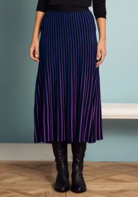 We’re excited to share our vibrant new Multi Stripe Skirt in tones of fuchsia and electric blue. The fuchsia matches back perfectly with our Scoop Hem Jumper, made from a warming wool/cotton yarn. The black tones of the skirt are lifted by adding black accessories that make the colour pop — we’ve chosen the cosy black Faux Fur Collar and Tall Georgine Boot for a bright, elegant look that takes us from day to night.
