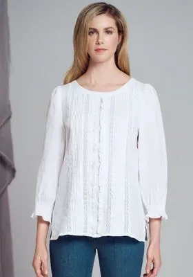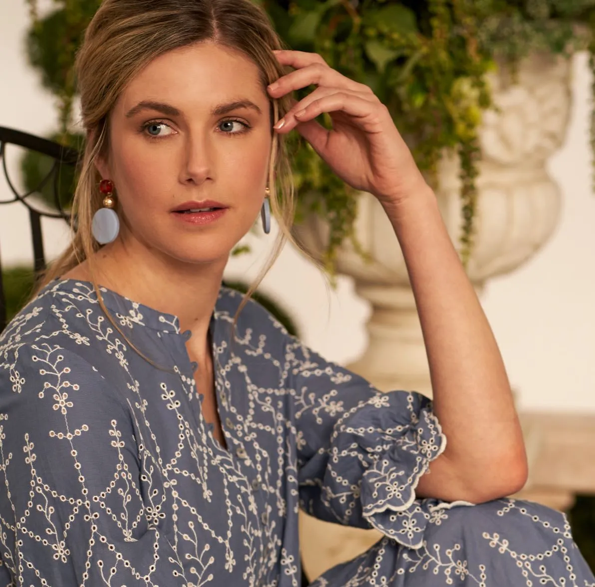 This blouse is made from 100% French linen, with elasticated cuffs with the option of wearing pushed back for a little extra style. The lace panels on the front are individually sewn with exquisite detail, adding delicate character to the blouse. Contrast it with the vibrant Emmanuelle Beaded Clutch in tones of dusty orange and red.