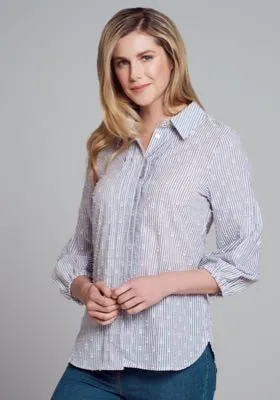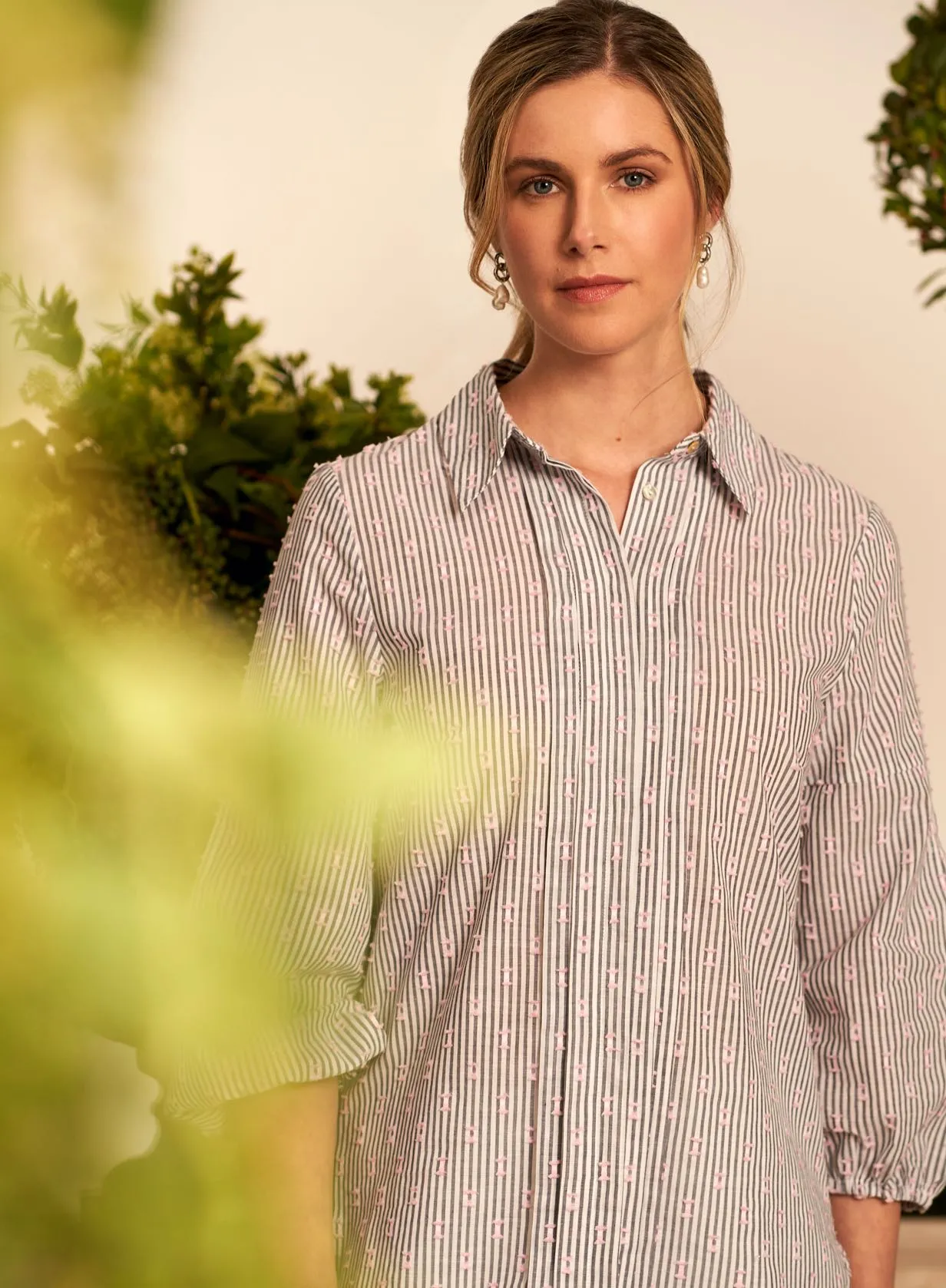 This pinstripe version has a statement pink jacquard design, adding character to a classic. Featuring balloon sleeves and pleat detail through the front, this shirt is made from lightweight 100% cotton. For an elegant touch, add our Le Lien Pearl Earrings.
