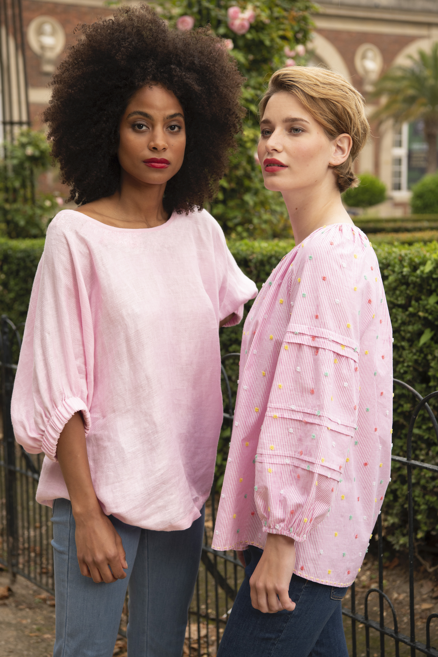 Both our Spot and Stripe Cotton Top and French Linen Stripe Tunic are perfect options for adding brightness to a casual look as you soak up the sun. Pair these tops with a bleached denim Bengajean® and the Timing Shimmer Shoe flats for a fresh new look.