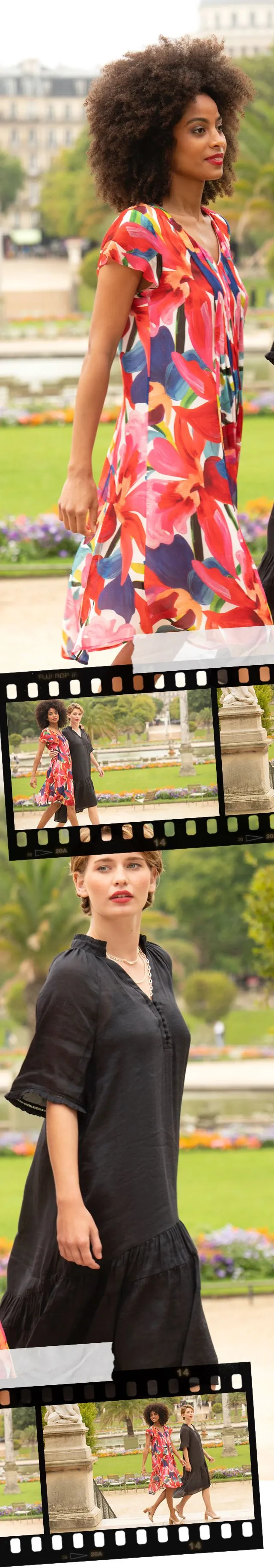 Our Flutter Sleeve Dress makes a statement in our hand-painted orchid print, and our black Ruffle Dress is a summer wardrobe essential, made from silk and French linen. Both light and breezy options, compliment either dress with our Painted Orchid Silk Scarf.