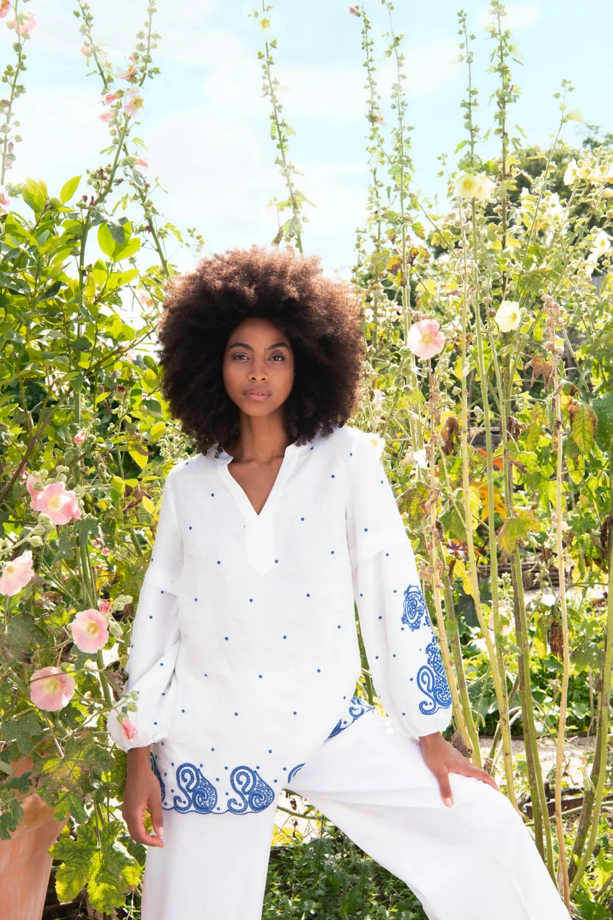 Spring fever is upon us, and it’s the perfect time to feel refreshed in cool summer fabrics and colours. Our French Linen Embroidered Top is made from 100% breathable and soft French linen, with delicate paisley embroidery around the hem and sleeves. Match it with white tones for a sophisticated summer feel, like our comfortable Summer Linen Culotte.