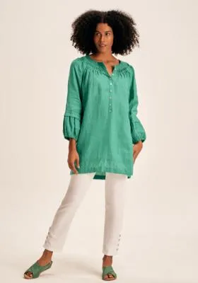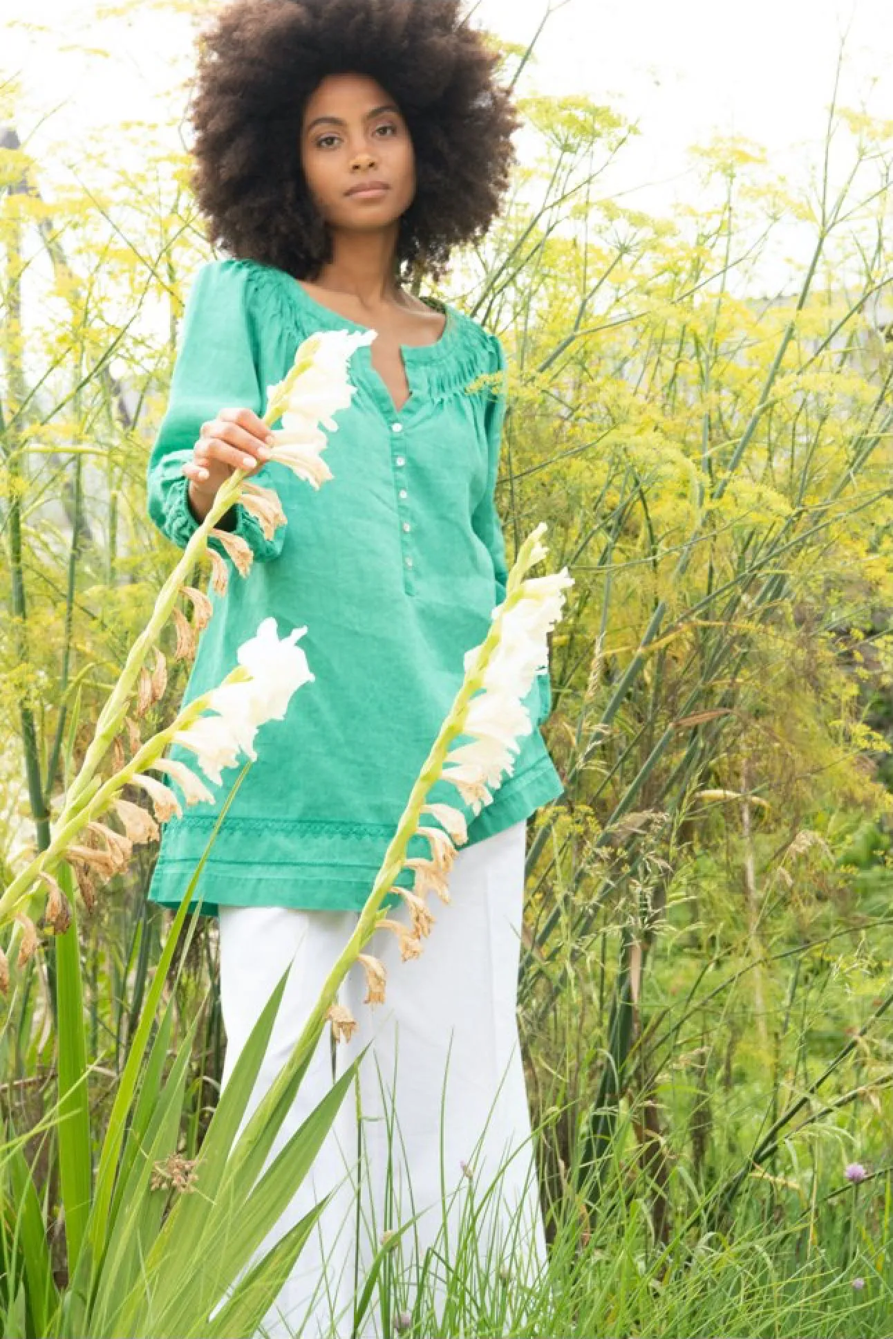 Add a splash of summer colour to your look with our Pleated French Linen Kaftan, in our season favourite colour ‘apple green’. The kaftan has a soft wash that gives the fabric a luscious feel, it also features delicate detailing and embroidery throughout. Wear it with our Summer Linen Culotte for something casual and bright, finished with our Harli Cross Strap flats in matching green.