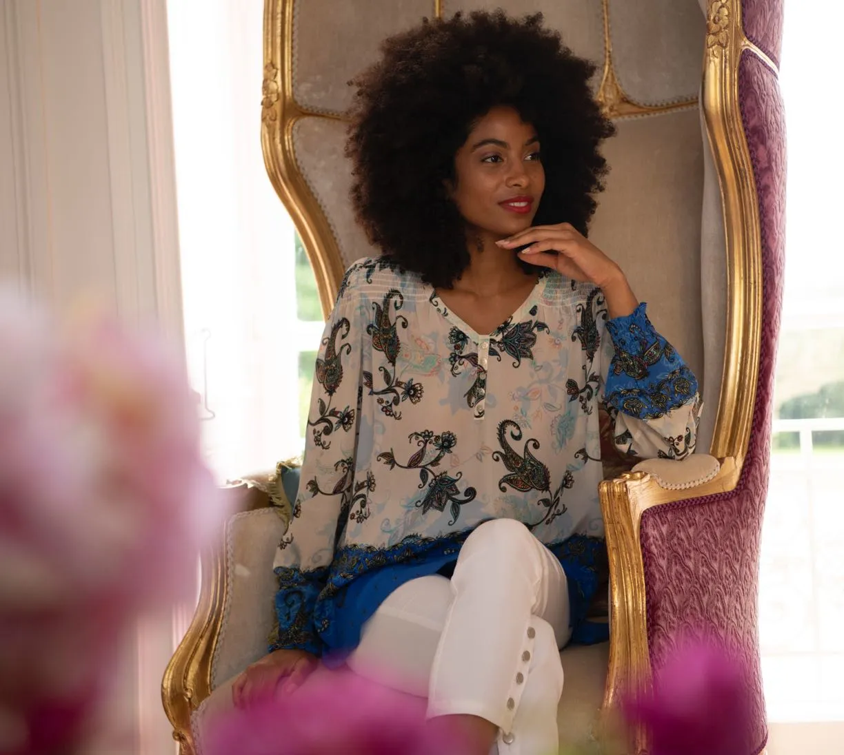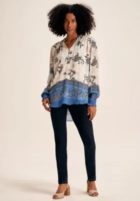 This seasons blue shadow print also features in our Shirred Border Print Blouse. Light and breathable, this blouse has a floaty, feminine feel, with a double-layered body for added cover. Perfect for elegant day wear, match with the Bengajean® 7/8 Button Detail and our Rudy Nude Square Toe Heels for added lift.