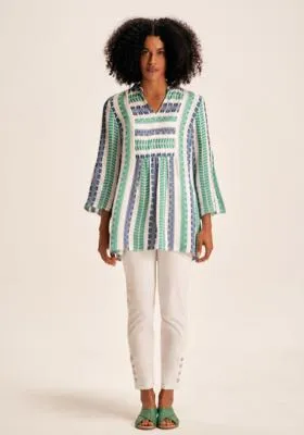 Our new Trumpet Sleeve Kaftan comes in a vibrant multi-tone stripe that bursts with summer feeling. An anytime option perfect for stylish beach days or casual dinners, it features ¾ trumpet sleeves for added fun flare. For a vibrant outfit, match it with our Bengajean® 7/8 Button Detail in white, finished with our Harli Cross Strap Flats in apple green.