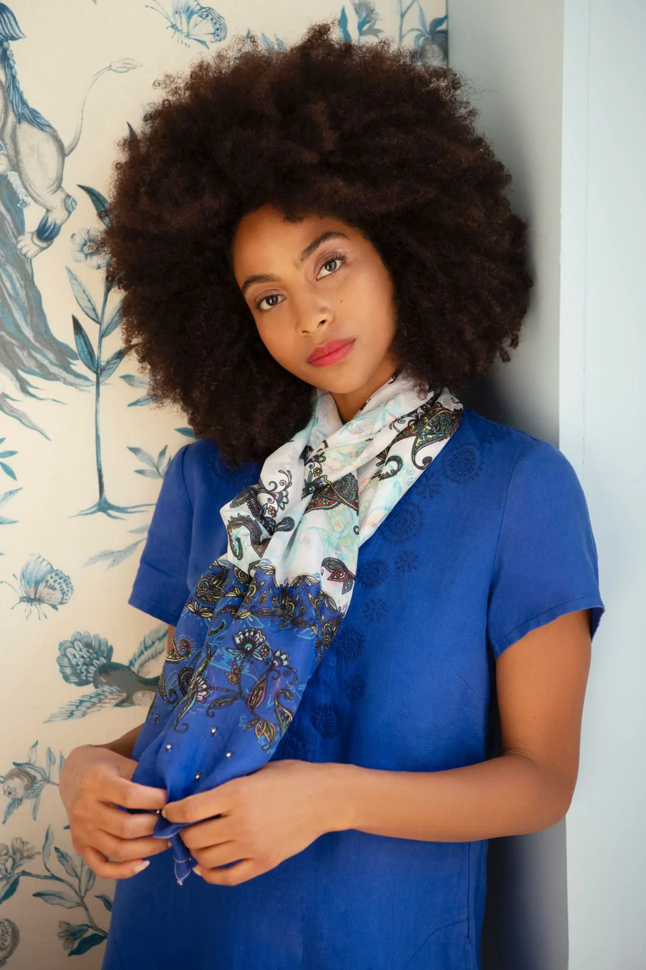 In a favori Blue Illusion shape, the 100% French linen Embroidered Dress is an easy-wear summer option. Available in vibrant electric blue, the dress features embroidery around the front neckline for added style, in a breezy A-line shape. Pair it with our Vintage Border Silk Scarf for an elegant lift.