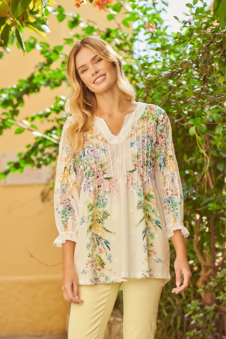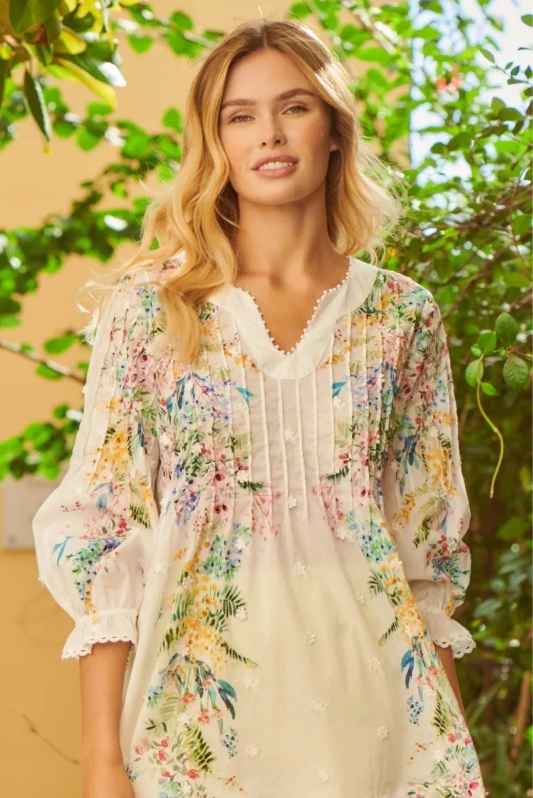 Our Floral Pleated Kaftan is the belle of the summer ball. Inspired by Riviera living in the south of France it is pretty and feminine, in light 100% cotton. With embroidered flowers through the print, the kaftan creates a floaty relaxed feel, perfect for cocktails by the sea.