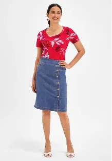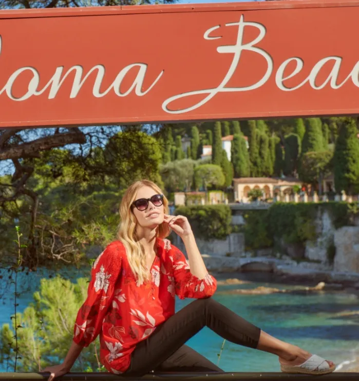 Paloma Beach is a French hotspot for those in the know. In a rouge floral print, the Shirring Swing Top is ultimate feminine chic, perfect for romantic walks by the seaside. Keep it comfortable in our Riviera Cross Quilt Espadrilles, with the Bengajean® 7/8 Button Detail for chic style.