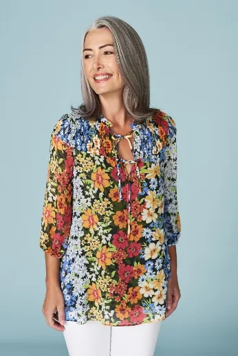 Silky-smooth in 100% viscose with an on-trend, removable French-inspired neck tie, this modern design looks trés chic with its matching Geometric Print Skirt. Mix and match these pieces for magnifique style and versatility.