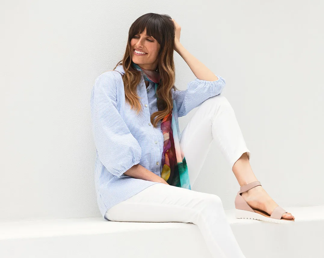 Crisp fresh whites and washed dusty blues are the true essence of sea living. Unwind in one of our striped puff-sleeve shirts, accompanied with a comfortable white Bengajean®. Add an accessory with a burst of colour to offset the clean neutral shades, taking the look from breakfast to brunch.
